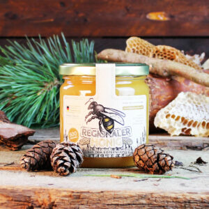 Die dunkle Bernsteinfarbe ist aber charakteristisch für Kiefernhonig und lässt einen hohen Anteil Kiefernhonig vermuten.